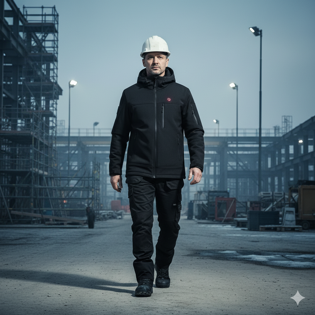 Bruker den på byggeplassen, og den tåler både regn og vind. Varmen er behagelig, ikke for sterk, og den holder hele arbeidsdagen.
